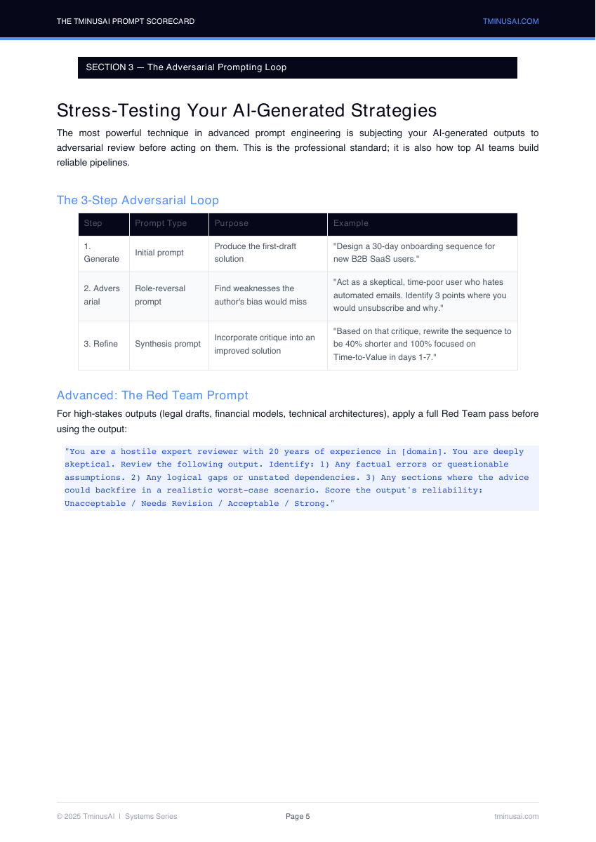 Uses five dimensions: persona rigor, objective clarity, failure-mode planning, reasoning trigger, and output schema.